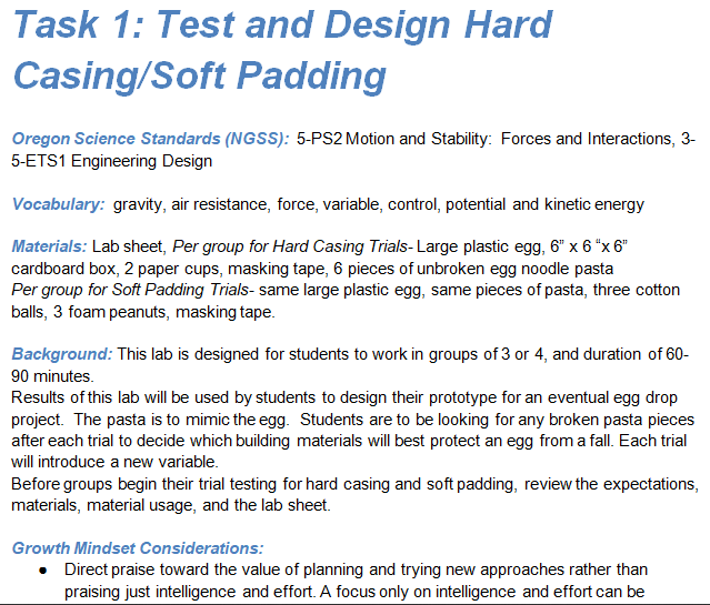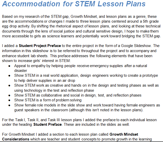 Research shows an increase in the number of STEM related jobs, however a disproportionate number of these jobs are held by women. This is the STEM gap. After researching methods for bridging this gap, I developed STEM accommodations for 3 egg drop lesson plans by adding a student preface and growth mindset guidelines to engage all learners.This project emphasizes my skills in subject matter familiarity, research, audience awareness, and content development. Technologies used were Google Docs and Google Slides.